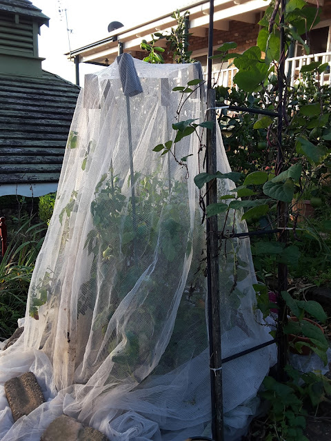 John covered the tomatoes for me with some netting as I didn't want any fruit fly attacking them. They have put on some marvellous growth with all the rain. It is still quite warm for them to grow well.