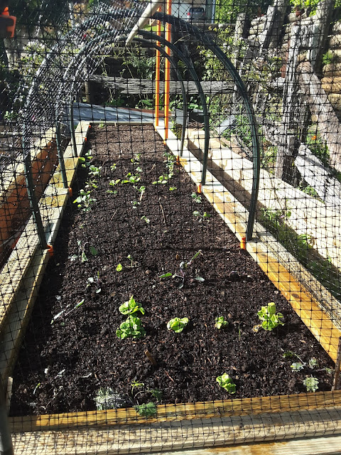 The first wood bed is doing well, I have discovered that the black mesh still lets the white butterfly in so spending too much time looking for eggs and caterpillars. I have asked John to change over to vegenet instead. The ends are stapled on to pieces of wood, to the width of each section, and can be rolled up when not in use. The wood strip placed on the ledge and the fabric thrown over to the other side, with the 2nd. wood strip. A special one will be made for the ends.